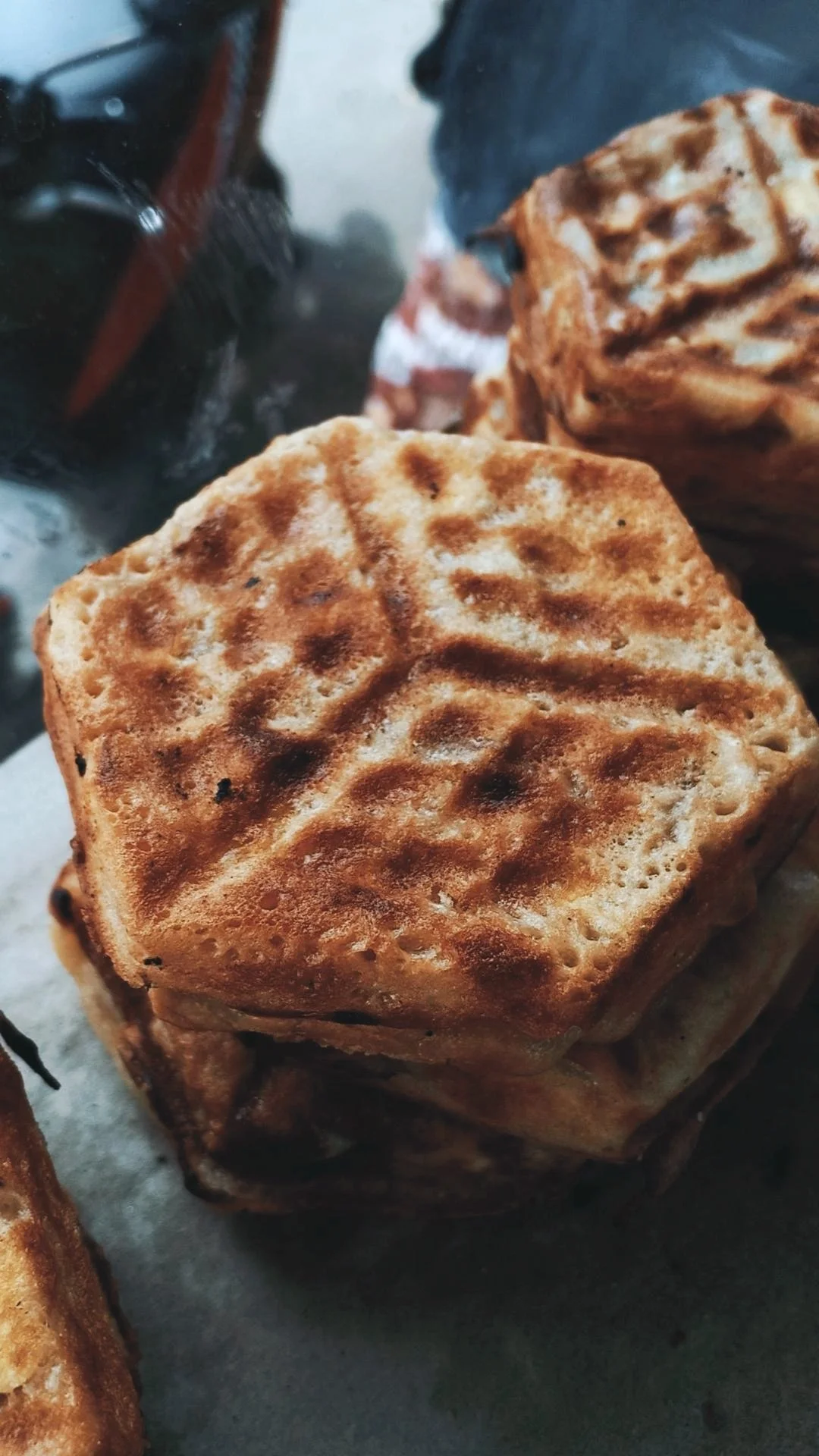 Dengan pengalaman bertahun – tahun, Bapak dengan cekatan membalikan cetakan, memastikan adonan merata, lalu meletakannya kembali di atas bara arang. Bapak dengan hati – hati memeriksa tingkat kematangan setiap kue dapel. Hanya membutuhkan waktu dua sampai tiga menit hinggal kue dapel matang. Aroma manis vanili dan gula yang terkaramelisasi mulai memenuhi udara. Sementara kue dapel dipanggang, saya melihat Ibu Juffri dengan teliti melipat kotak – kotak kecil, mempersiapkannya untuk mengemas kue dapel. Sementara itu Pak Juffri mulai memangkas sisa – sisa adonan yang meluber di pinggiran cetakan, memastikan setiap kue terlihat rapi dan seragam. Dengan terampil, ia memastikan kematangan setiap kue tepat. Setiap gerakannya cepat dan sudah terlihat naluriah. Meskipun kue dapel matang dengan cukup cepat, aromanya yang kaya dan menggoda membuatnya sulit ditolak. Penasaran dengan aroma khas kue dapel, saya bertanya kepada Bapak,