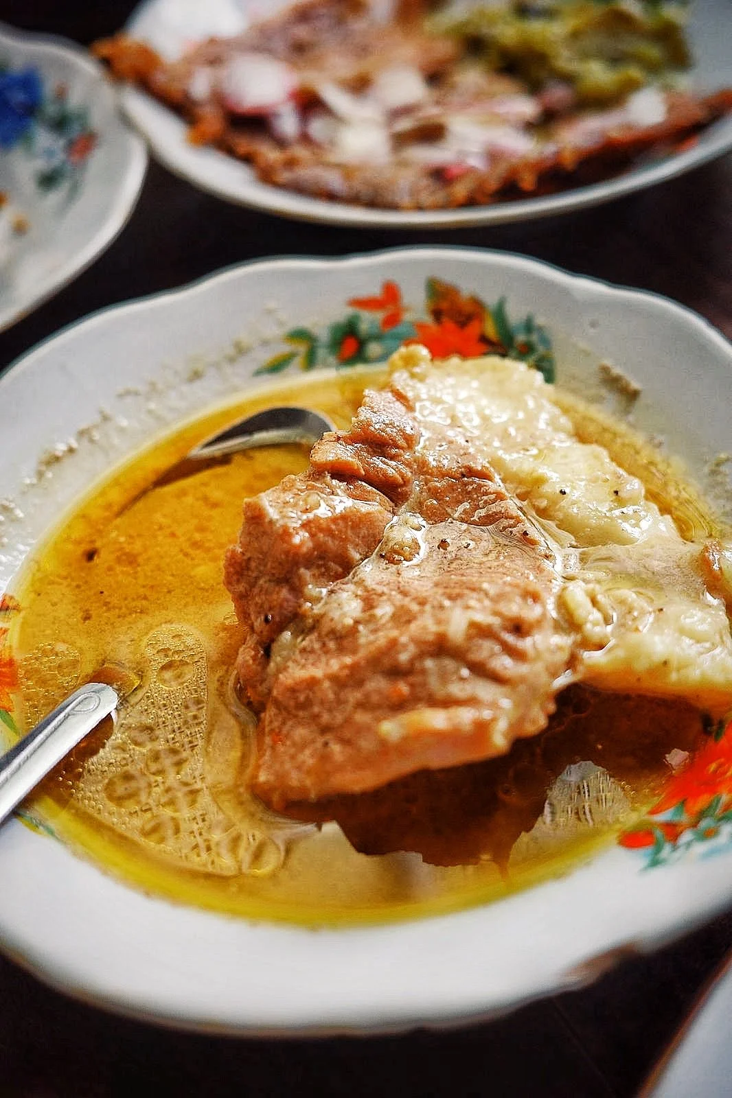“Mau gulai gajeboh?” tawarnya. Tentu saya mengangguk. Gulai gajeboh memang jarang muncul di rumah makan pada umumnya. Semangkuk gulai kekuningan yang tampak encer hadir di meja dengan tetelan yang sebagian masih menempel pada lemak. Uni Reno yang hendak merekam video kemudian meminta saya menuang kuah keatas gajeboh. Kuahnya mengingatkan saya sedikit pada soto: ringan, tapi cocok bersatu dengan gajeboh yang lembut saat digigit.