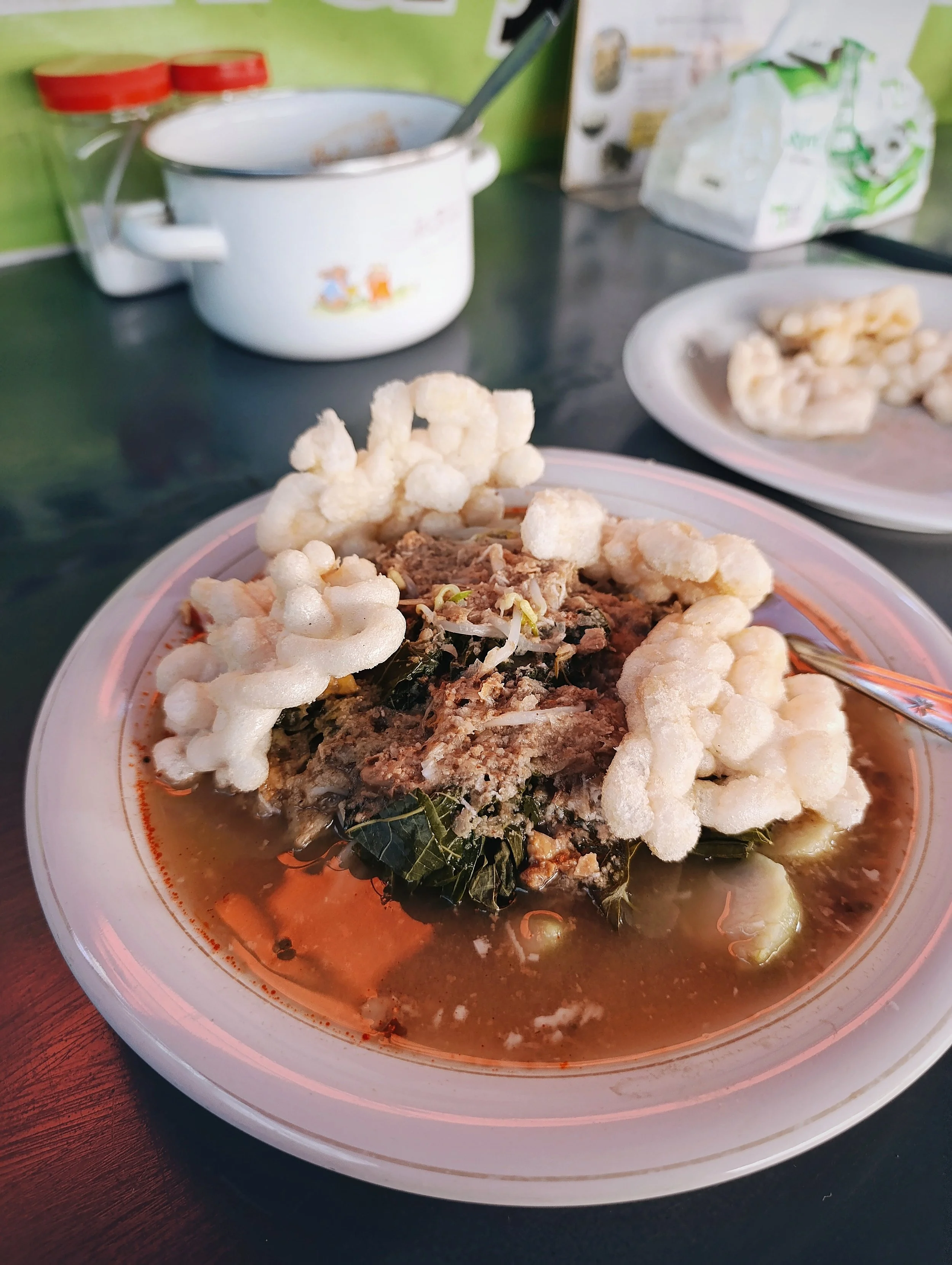 Menyebrang sedikit, saya menemukan warung yang menyajikan docang, hidangan lontong, toge, kembang kol yang disiram kuah oncom, ditaburi kelapa parut, dan disantap bersama kerupuk. Docang Putra Tunggal menjadi docang yang lagi-lagi baru pertama kali saya coba. Rasanya tak familiar namun memang sangat pas untuk dijadikan hidangan sarapan pagi.