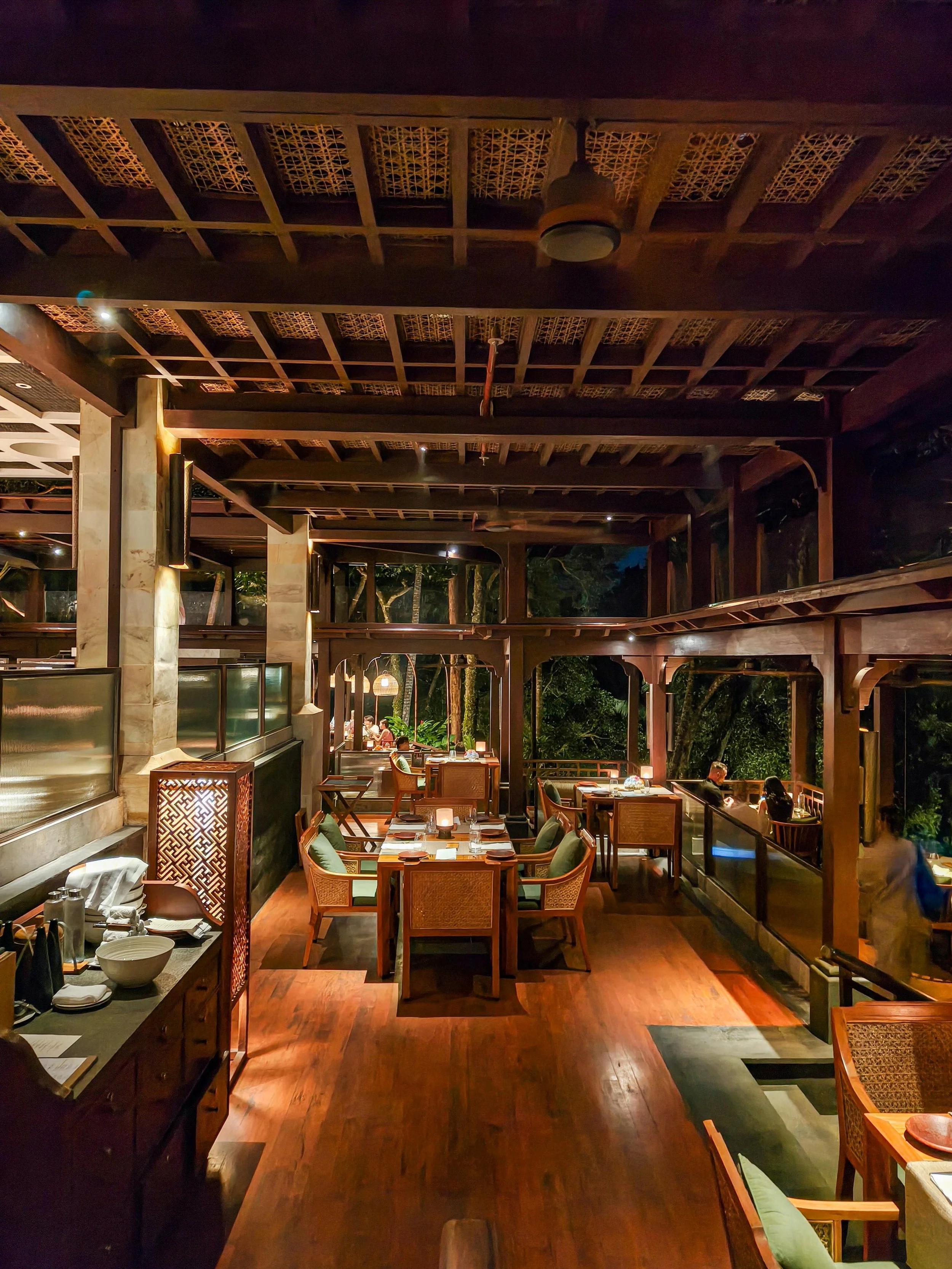 Saat malam tiba, Sawah Terrace menjelma menjadi ruang makan yang memukau. Dikelilingi bayangan pepohonan dan gemuruh lembut sungai di kejauhan, lentera gantung memantulkan cahaya temaram di atas meja-meja kayu. Beberapa sisi dibiarkan terbuka, membuka ruang bagi udara Ubud yang sejuk masuk perlahan. Semua elemen berpadu membentuk pengalaman bersantap yang intim, seolah waktu berjalan lebih lambat, memberi kesempatan untuk benar-benar menikmati setiap suap dan suasana.